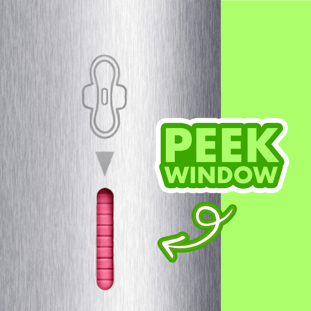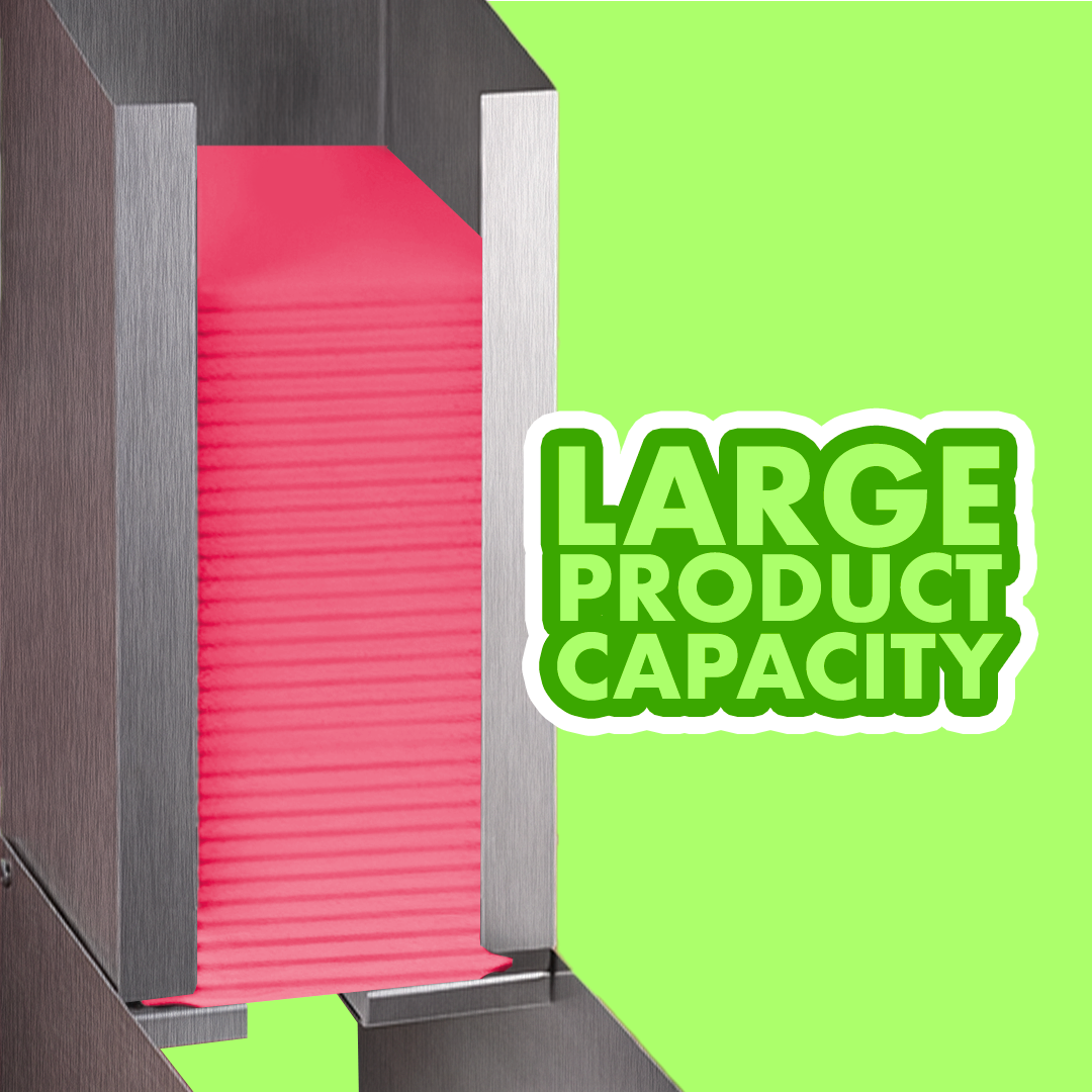 Our dispenser holds 6x the amount of product. Model S holds 60 Sanitary Napkins, 60 Tampons, and 60 Wet Wipes. We made it both simple and quick to reload compared to other period product dispensers.